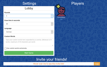 Bei den Einstellungen ("Settings") könnt ihr nun angeben, wie viele Runden ihr spielen wollt (pro Runde sind alle SpielerInnen einmal dran mit Zeichnen), wie viel Zeit sein soll zum Raten, die Sprache auswählen und eigene Wörter zum Raten einfügen ("Custom words"). Ansonsten hat das Programm auch super viele vorgefertigte Wörter, diese Funktion müsst ihr also nicht unbedingt nutzen. Ist alles eingestellt, könnt ihr unten unter "Invite your friends" den Link zu eurem Privaten Raum kopieren und an alle MitspielerInnen verteilen.